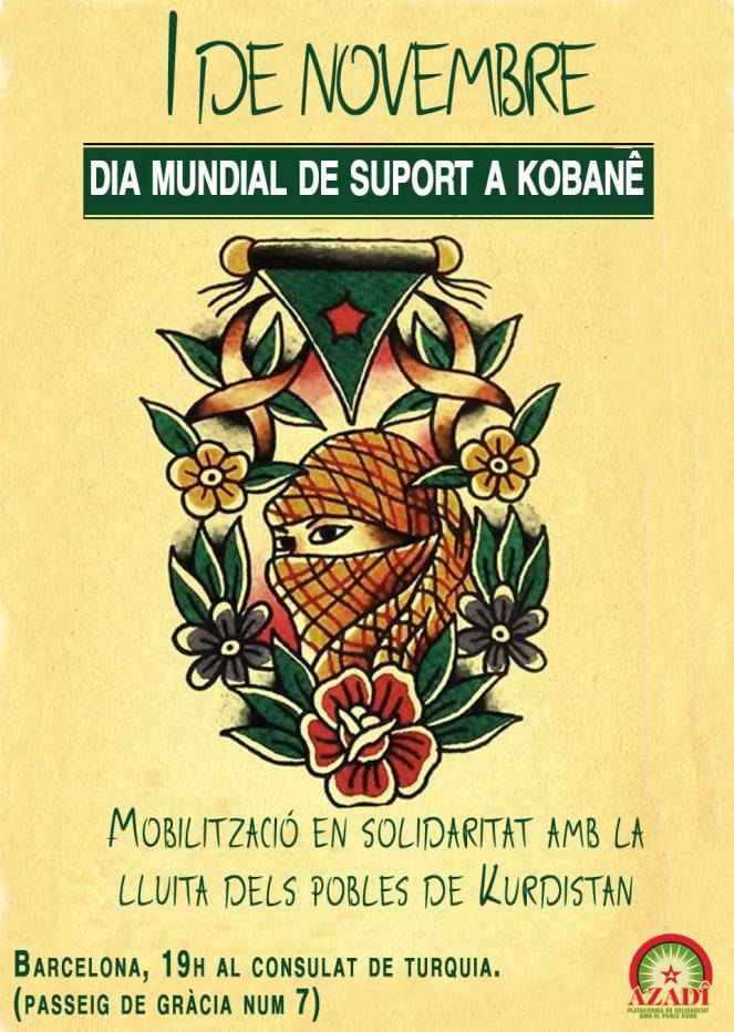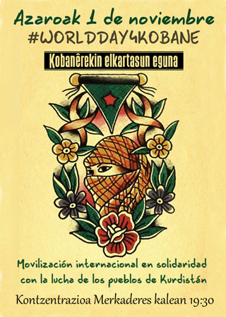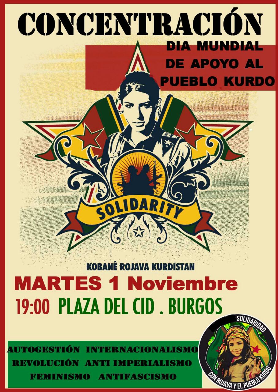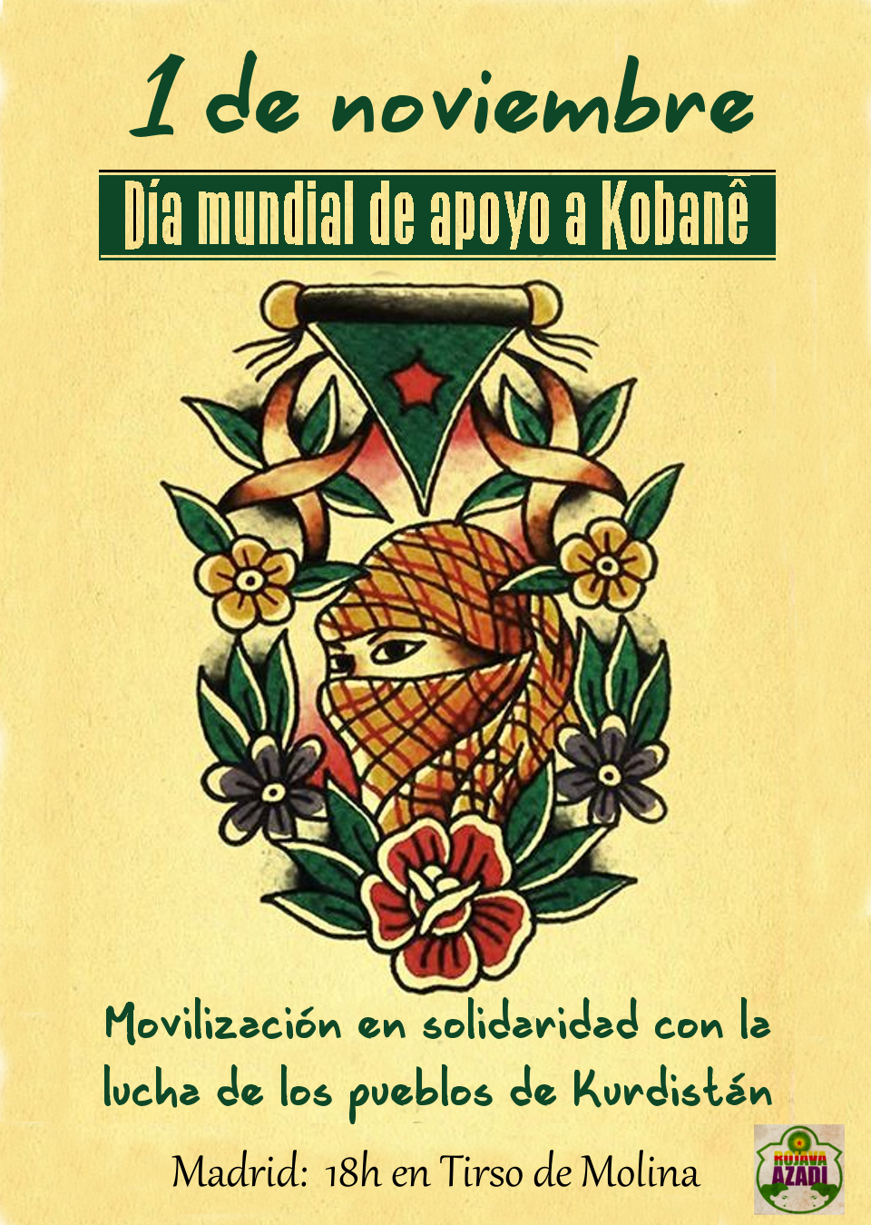 El 1 de noviembre por el «Kobanê World Day» varias organizaciones políticas y sociales han convocado manifestaciones en las ciudades de Barcelona, Burgos, Iruña y Madrid apoyando la revolución social de Rojava y en contra de las políticas genocidas del gobierno turco contra la población kurda en Oriente Próximo.